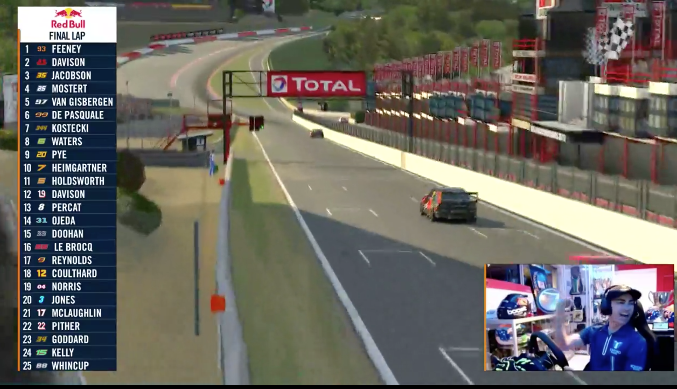 In-between the two chaotic races, teenager Broc Feeney became the first wildcard entry to claim a victory in the virtual series, taking out top spot in the reverse-grid race over Will Davison and Garry Jacobson, while van Gisbergen and De Pasquale finished fifth and sixth respectively.